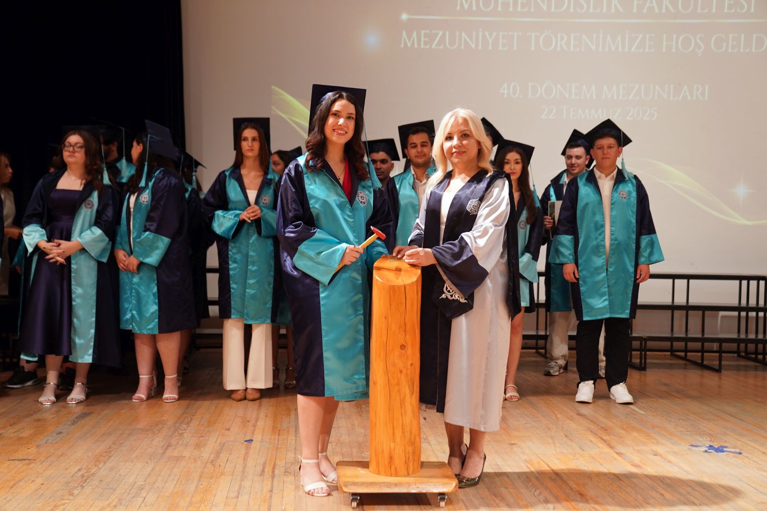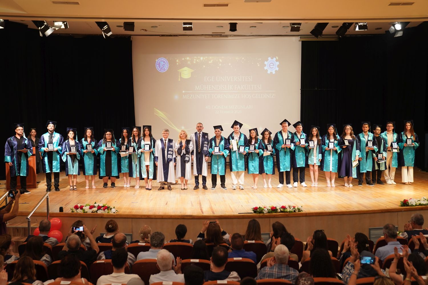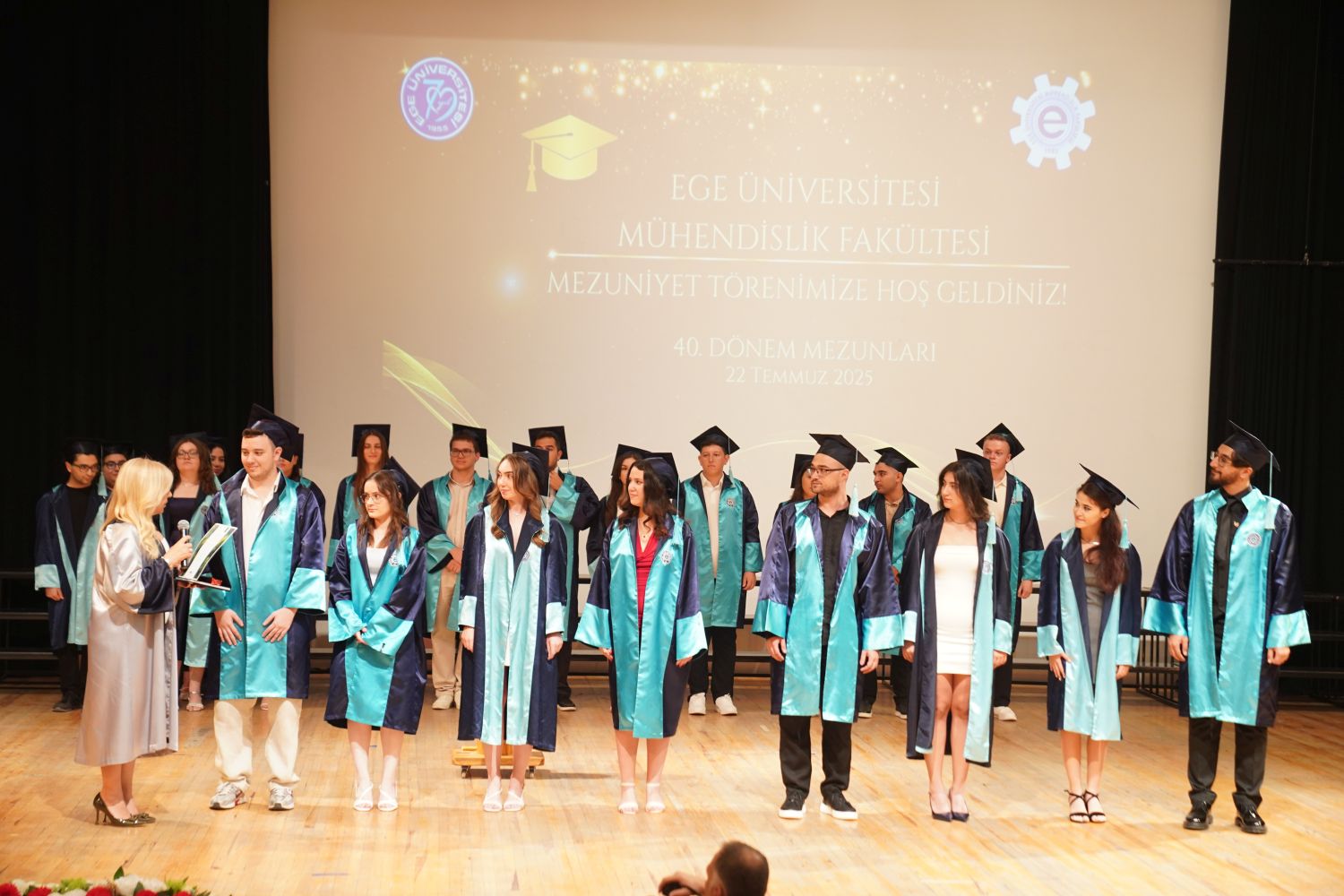 Ege Üniversitesi (EÜ) Mühendislik Fakültesi, 2024-2025 eğitim-öğretim yılı, 40. dönem mezunlarını Prof. Dr. Yusuf Vardar MÖTBE Kültür Merkezinde düzenlenen coşkulu bir törenle uğurladı. Törene; EÜ Rektör Yardımcısı ve Mühendislik Fakültesi Dekanı Prof. Dr. İlkin Şengün, EÜ Rektör Yardımcıları Prof. Dr. Mehmet Ersan ve Prof. Dr. Devrim Bozkurt, Mühendislik Fakültesi Dekan Yardımcıları Prof. Dr. Özge Andiç Çakır ve Doç. Dr. Gözde Ertekin’in yanı sıra akademisyenler, öğrenciler ve aileler katıldı.