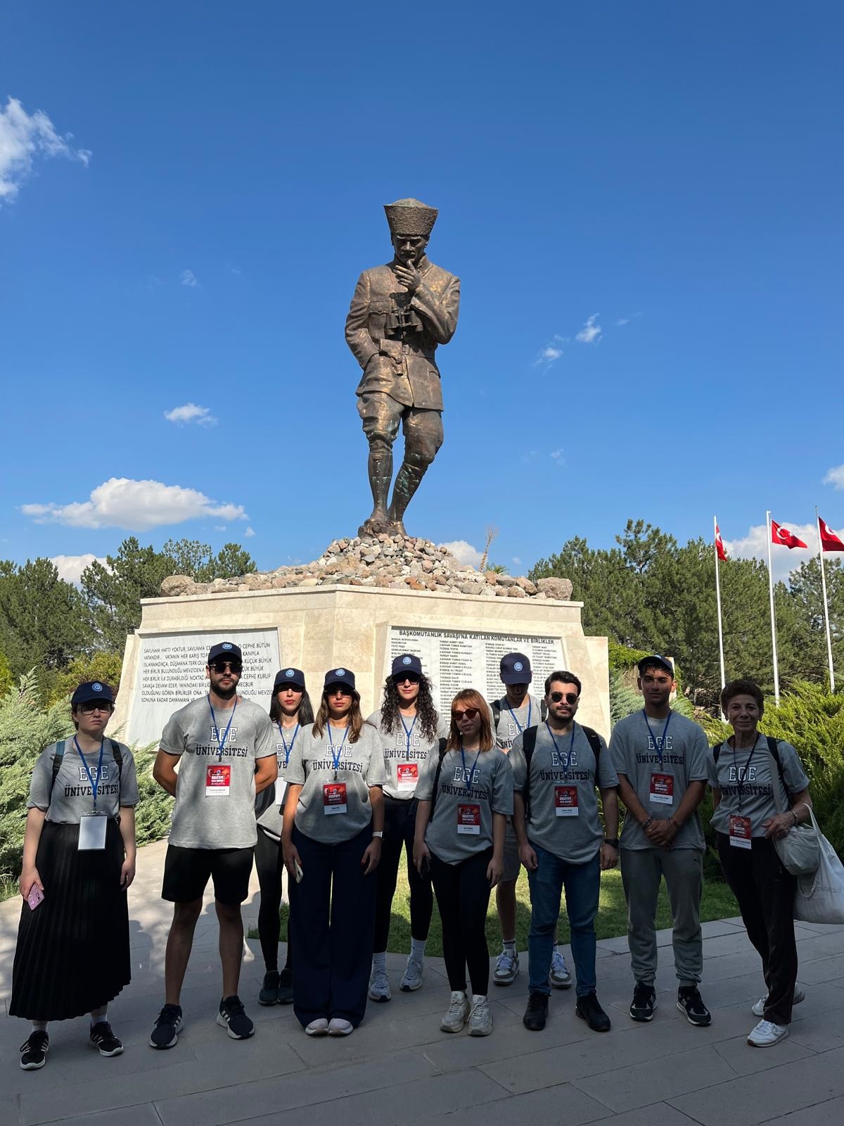 Ege Üniversitesi (EÜ) öğrencileri ve akademisyenlerinden oluşan ekip,  Büyük Taarruz’un 103. yıl dönümü etkinlikleri kapsamında Afyonkarahisar’da düzenlenen “Kocatepe Zafer Yürüyüşü”ne katıldı. EÜ Spor Bilimleri Fakültesi Öğretim Üyesi Doç. Dr. Emine Kutlay’ın koordinatörlüğündeki Ege Üniversitesi öğrencileri, Yüzbaşı Agah Efendi Şehitliğini, Büyük Taarruz Şehitliğini, İstiklal Tanıtım Merkezini, Şuhut ilçesinde bulunan ve Gazi Mustafa Kemal Atatürk’ün Büyük Taarruz öncesinde karargâh olarak kullandığı Atatürk Evini de ziyaret etti.