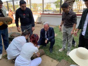 Ege Üniversitesi (EÜ) Bayındır Meslek Yüksekokulu (MYO), İzmir Adliye Sarayı Protokol Girişi Alanının peyzaj yenileme çalışmalarını gerçekleştirdi. Meslek Yüksekokulu öğrencilerinin de katıldığı çalışmaya Karayolları Bölge Müdürlüğü, Devlet Su İşleri ve Belediye çalışanları da destek verdi. Bayındır MYO Müdürü Doç. Dr. Ali Salman ve Müdür Yardımcısı Öğr. Gör Dr. Meltem Wallace; uygulama öncesi yapılacak çalışma hakkında İzmir Cumhuriyet Başsavcısı Ali Yeldan, Cumhuriyet Başsavcı Vekilleri Soner Gül ve Aydoğan Sansak’a bilgilendirmede bulundular.