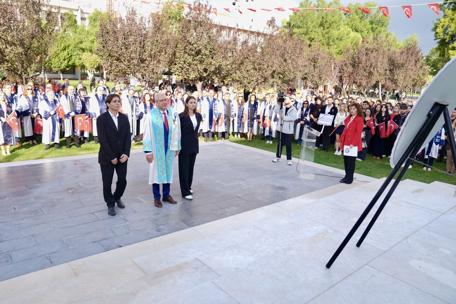 Ege Üniversitesi 29 Ekim Cumhuriyet Bayramı Töreni, Ege Üniversitesi Kampüsü 100. Yıl Anıtı önünde gerçekleştirildi. Törene, Ege Üniversitesi Rektörü Prof. Dr. Necdet Budak, EÜ Üst yönetimi, senato üyeleri, akademisyenler, idari çalışanlar ve öğrenciler katıldı.