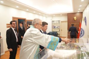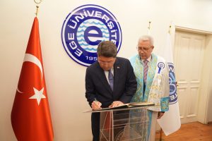 Akademik yıl açılış töreni öncesi Ege Üniversitesi Rektörü Prof. Dr. Budak’ı makamında ziyaret eden Adalet Bakanı Yılmaz Tunç üniversite şeref defterini imzaladıktan sonra Ege Üniversitesinin çalışmaları hakkında bilgi aldı.