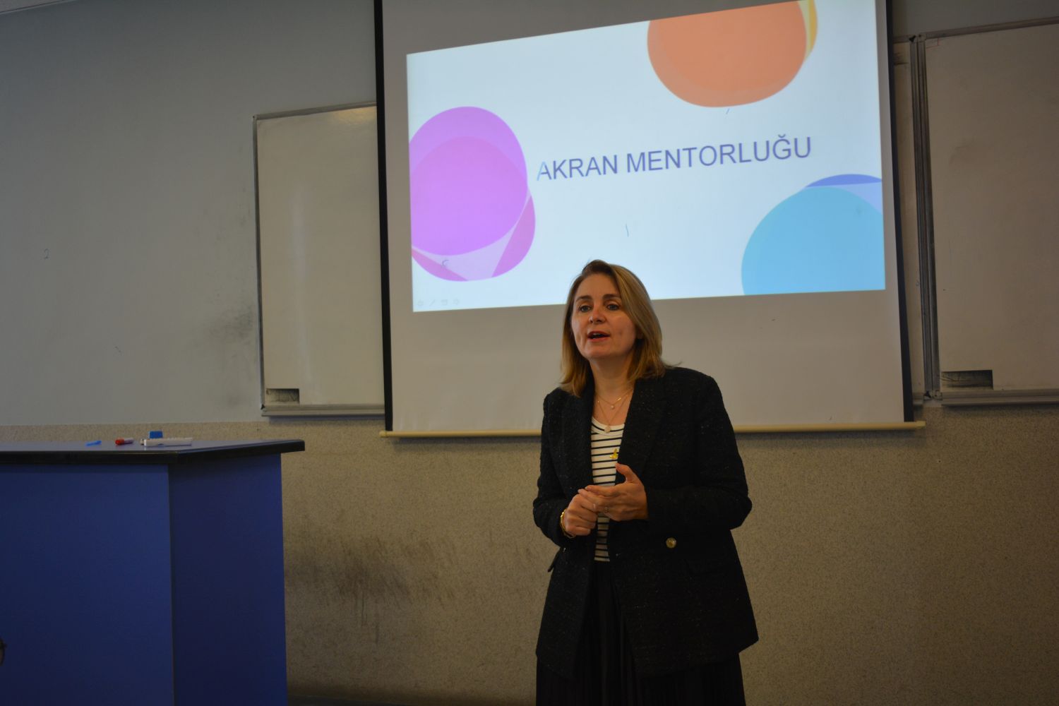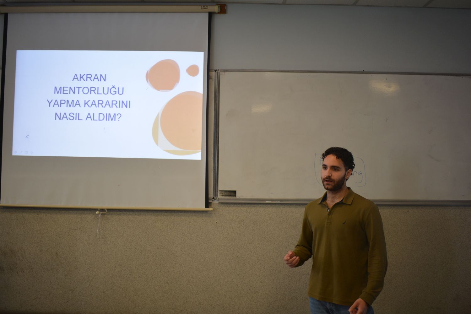 EÜ Mühendislik Fakültesi  İnşaat Mühendisliği Bölümü dersliklerinde düzenlenen etkinlikte İnşaat Mühendisliği Bölümü 3. sınıf öğrencisi Serhan Sarp Bolsoy, akran mentörlüğü sürecinde edindiği deneyimleri ve bu modelin engelli bireylerin sosyal ve akademik gelişimine katkılarını katılımcılarla paylaştı.