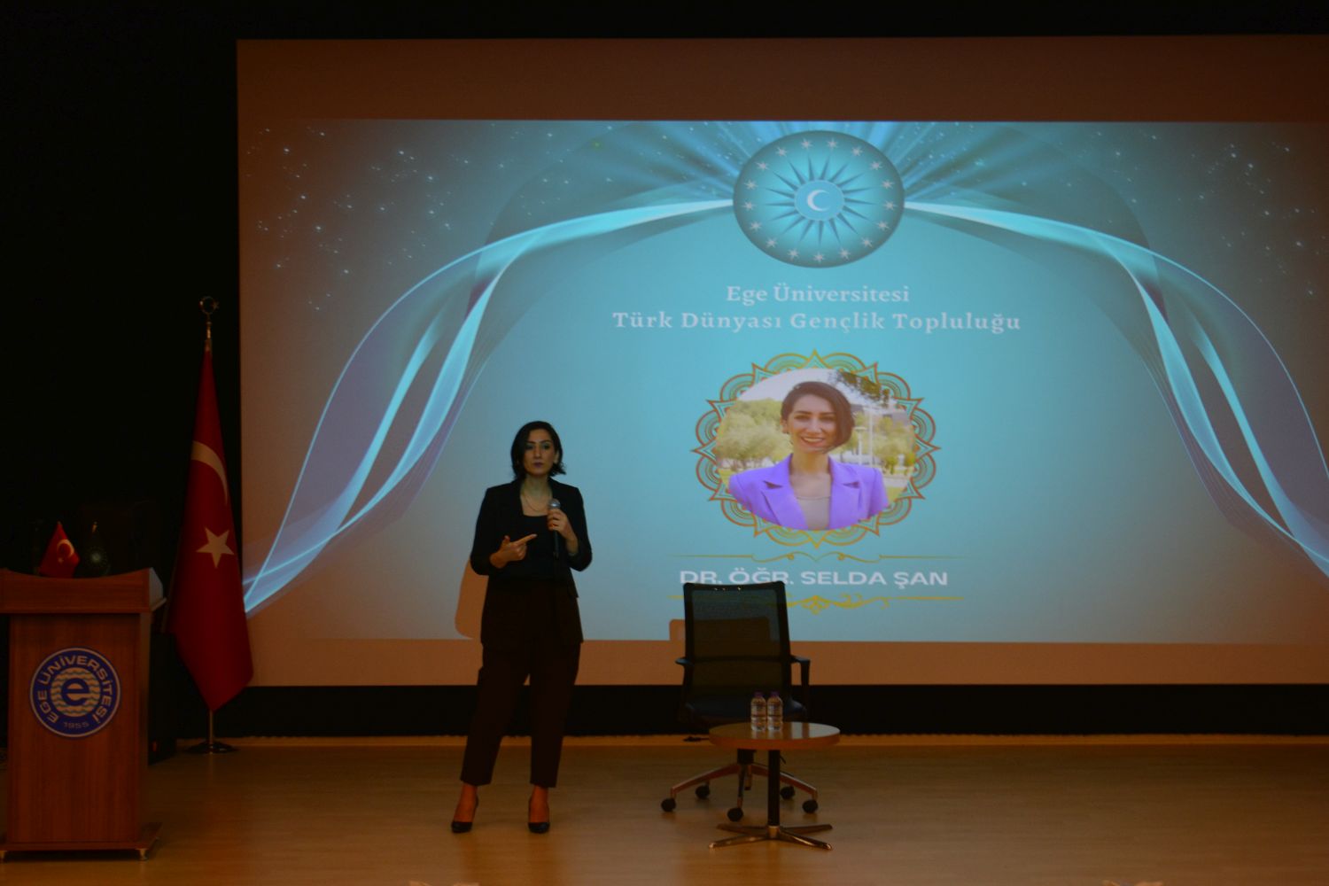 Ege Üniversitesi Türk Dünyası Gençlik Topluluğu tarafından düzenlenen “Türk Dünyası Gençlik Semineri”, İletişim Fakültesi Konferans Salonunda öğrencilerin katılımıyla gerçekleştirildi. Türk Dünyasına yönelik farkındalığı artırmak amacıyla düzenlenen etkinlikte; EÜ Eğitim Fakültesi öğretim üyesi Dr. Öğr. Üyesi Selda Şan ile EÜ Turan Film Festivali Yürütme Kurulu Üyesi Alper Akdeniz konuşmacı olarak yer aldı.