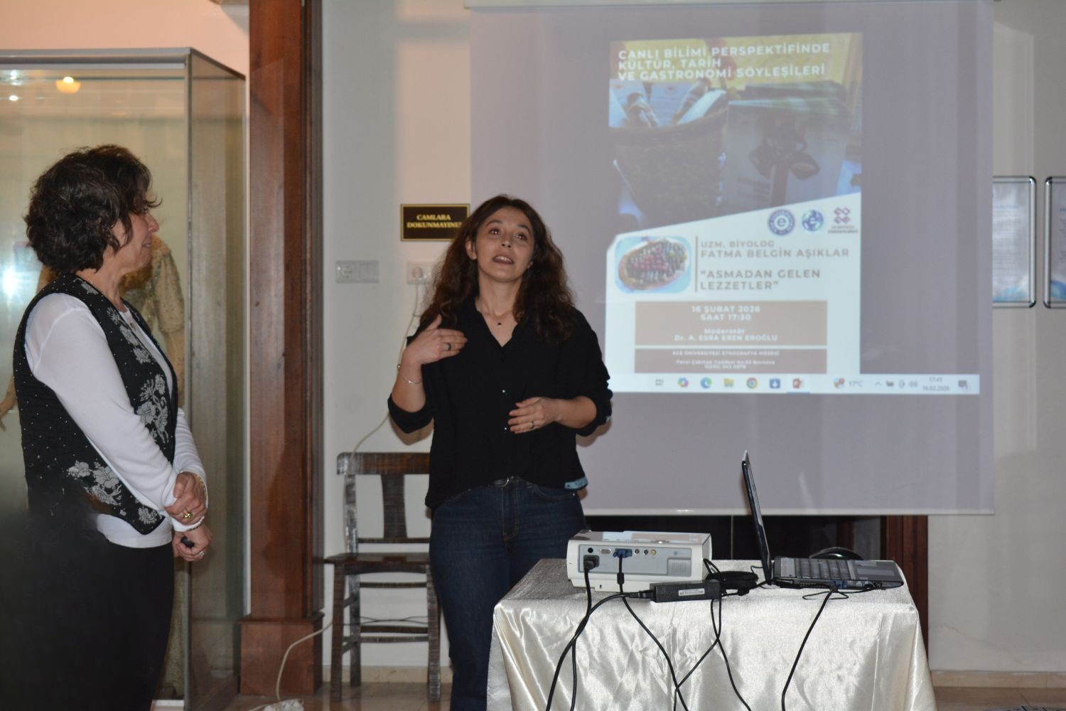 Ege Üniversitesi Etnografya Müzesi, kültürel mirası bilimsel perspektifle harmanlayan anlamlı bir etkinliğe ev sahipliği yaptı. “Canlı Bilimi Perspektifinde Kültür, Tarih ve Gastronomi Söyleşileri” dizisi kapsamında gerçekleştirilen “Asmadan Gelen Lezzetler” başlıklı etkinliğe, Etnografya Müzesi Müdürü Doç. Dr. Dilek Maktal Canko, EÜ Fen Fakültesi Biyoloji Bölümü Öğretim Üyesi Prof. Dr. İhsan Yaşa, akademisyenler ve konuya ilgi duyan vatandaşlar katıldı.