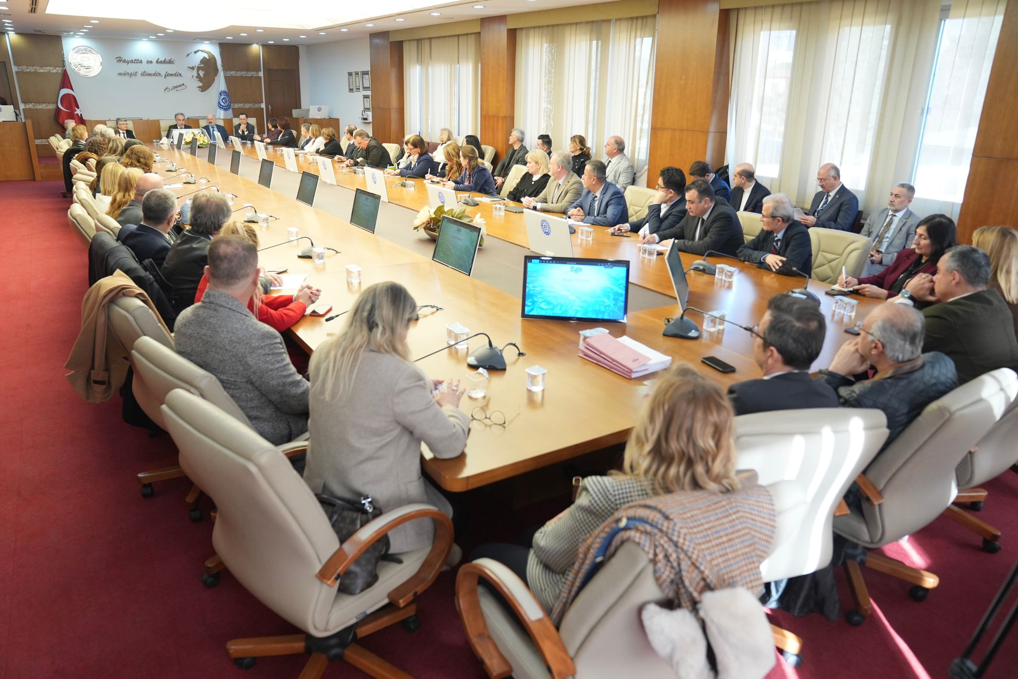 Ege Üniversitesi Senato Toplantısı Yeni Senato Salonu’nda gerçekleştirildi. Rektör Prof. Dr. Musa Alcı’nın başkanlığında yapılan toplantıya, akademik kariyerlerinde önemli bir aşamayı başarıyla tamamlayarak yeni unvan almaya hak kazanan öğretim üyeleri ve senatörler katıldı. Toplantıda, lisans programı ikinci kez beş yıllık tam akreditasyon alma başarısı gösteren Hemşirelik Fakültesinin belgesi Dekan Prof. Dr. Ayşegül Dönmez tarafından Rektör Prof. Dr. Musa Alcı’ya sunuldu. Ardından yeni unvan alan akademisyenler başarı belgelerini Rektör Prof. Dr. Musa Alcı’nın elinden aldı.