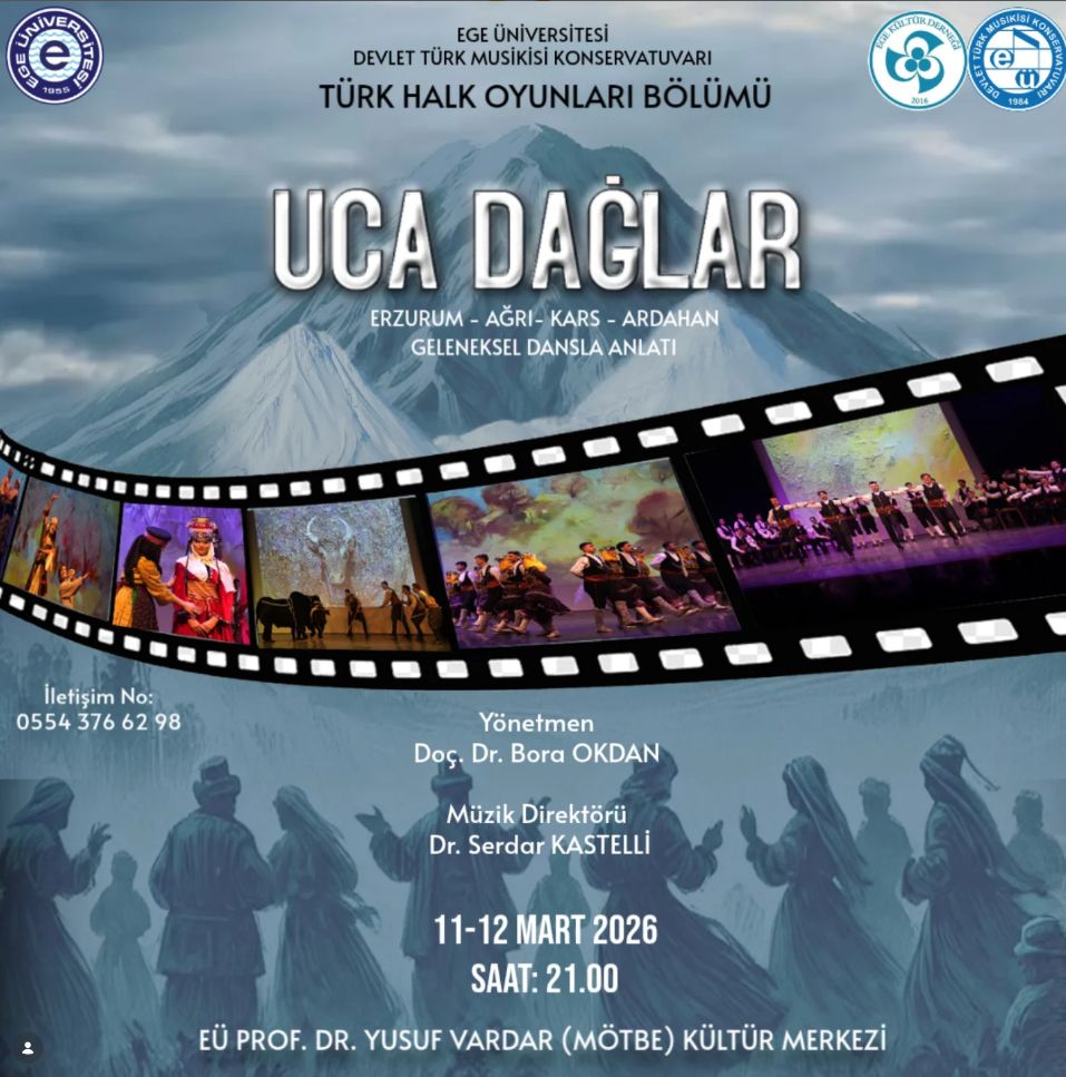 Ege Üniversitesi(EÜ) Devlet Türk Musikisi Konservatuvarı (DTMK) geleneksel Türk kültürünü modern sahne sanatlarıyla buluşturmaya devam ediyor. DTMK Türk Halk Oyunları Bölümü tarafından hazırlanan “Uca Dağlar” geleneksel dans anlatısı, 11-12 Mart 2026 tarihlerinde, saat 21.00’de Ege Üniversitesi Prof. Dr. Yusuf Vardar (MÖTBE) Kültür Merkezi’nde gerçekleştirilecek. Etkinlik,  müzik ve dans severleri Anadolu’nun zirvelerine doğru kültürel bir yolculuğa çıkarmaya hazırlanıyor.