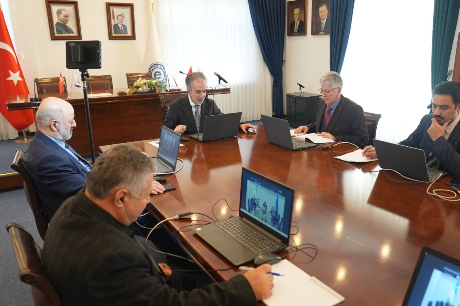 Çevrimiçi yapılan toplantıya her iki kurumun rektörlerinin yanı sıra; EÜ Rektör Yardımcıları Prof. Dr. Murat Boyacı ile Prof. Dr. Aydoğan Savran, Türk Dünyası ile İlişkiler ve Orhun Koordinatörü Doç. Dr. Fazıl Özdamar, EBİLTEM Müdürü Prof. Dr. Bahri Başaran ve Gıda Mühendisliği Bölüm Başkanı Prof. Dr. Nurcan Koca katıldı. Özbekistan Uluslararası Gıda Teknolojisi ve Mühendisliği Enstitüsünü ise Rektör Yardımcıları Prof. Dr. Şahide Hamdamova ile Doç. Dr. Ahrar Haşimov, Uluslararası İlişkiler Bölüm Başkanı Şahcahan Abdullayev, Gıda Teknolojisi ve Yönetimi Fakültesi Dekanı Doç. Dr. Daniyar Yoldaşev temsil etti.