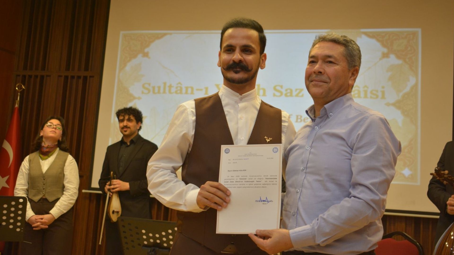 Etkinliğin sonunda eserleri icra eden öğrencilere ve koordinatör Öğr. Gör. Tolga Meriç’e teşekkür belgeleri, Prof. Dr. Alaskan tarafından takdim etti.