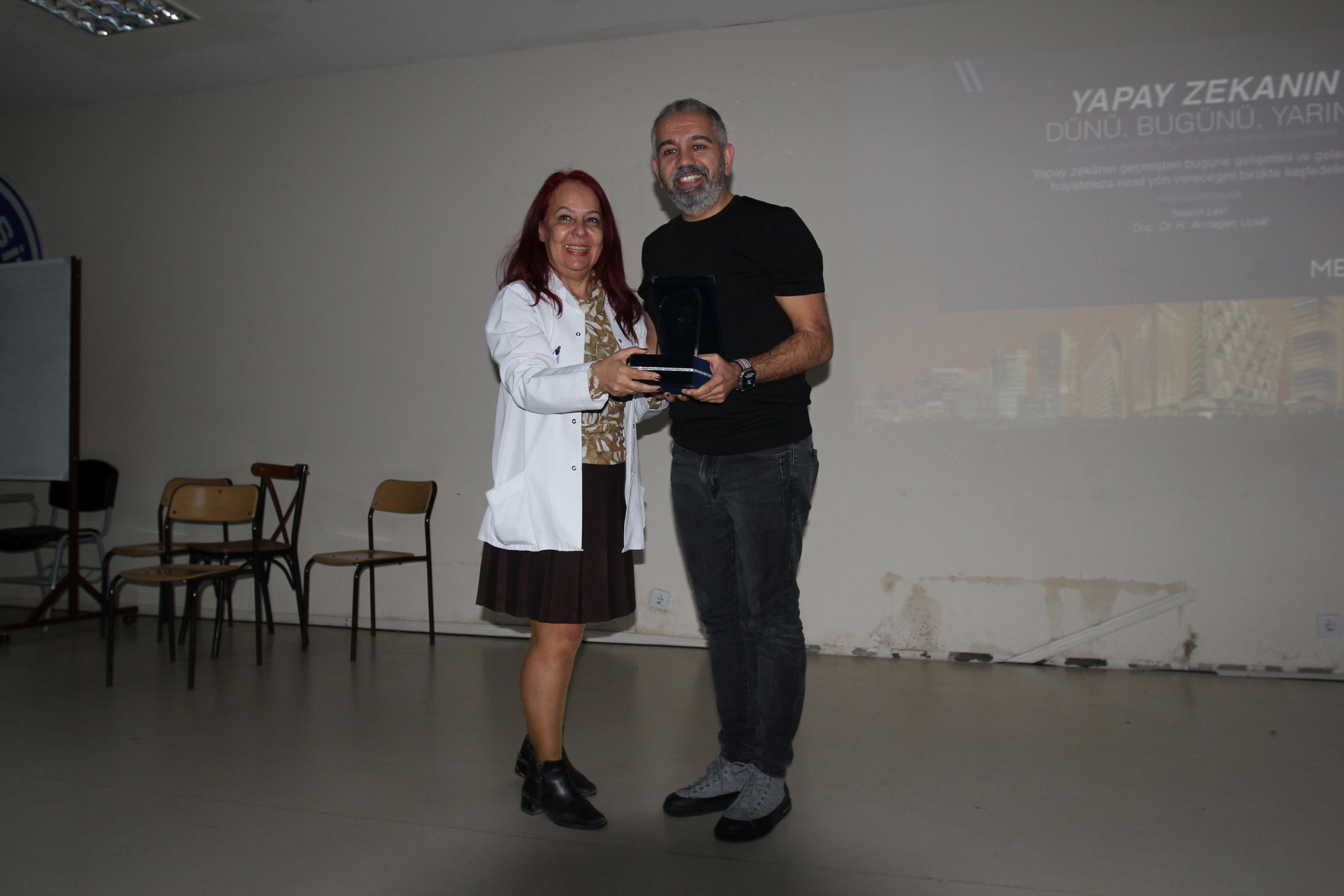 Konferansın nörolojik boyutunu ele alarak yapay zekânın çalışma prensipleri ile insan beynini kıyaslayan Doç. Dr. Armağan Uysal, “Teknolojinin insanı tembelleştirip bilincimizi yapay zekâya devredeceğimiz veya hızlıca Alzheimer olacağımız yönündeki kaygılar var. İyi haber şu ki, henüz orada değiliz. Yapay zekânın geçmişi sadece 80 yıl. İnsanlar olarak neden burada olduğumuzu ve ne yaptığımızı bilmeye endeksli bir bilişsel kondisyona sahibiz” diye konuştu. Konferans, öğrencilerin merak ettikleri soruların yanıtlanmasının ardından sona erdi. Etkinlik sonunda moderatör Prof. Dr. Sevnaz Şahin tarafından konuşmacılar Nesim Levi ve Doç. Dr. Armağan Uysal’a katkılarından dolayı Teşekkür Plaketi takdim edildi.