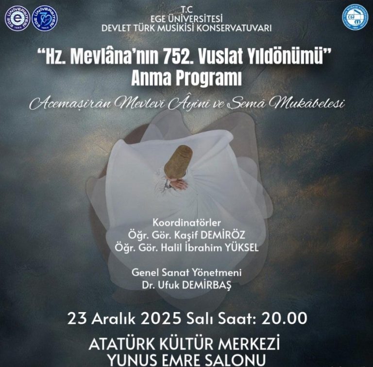 Ege Üniversitesi (EÜ) düzenlediği etkinliklerle üniversitenin sanatsal gücünü toplumla buluşturmaya devam ediyor. Ege Üniversitesi, Hz. Mevlana’nın vuslatının 752. yıl dönümü...